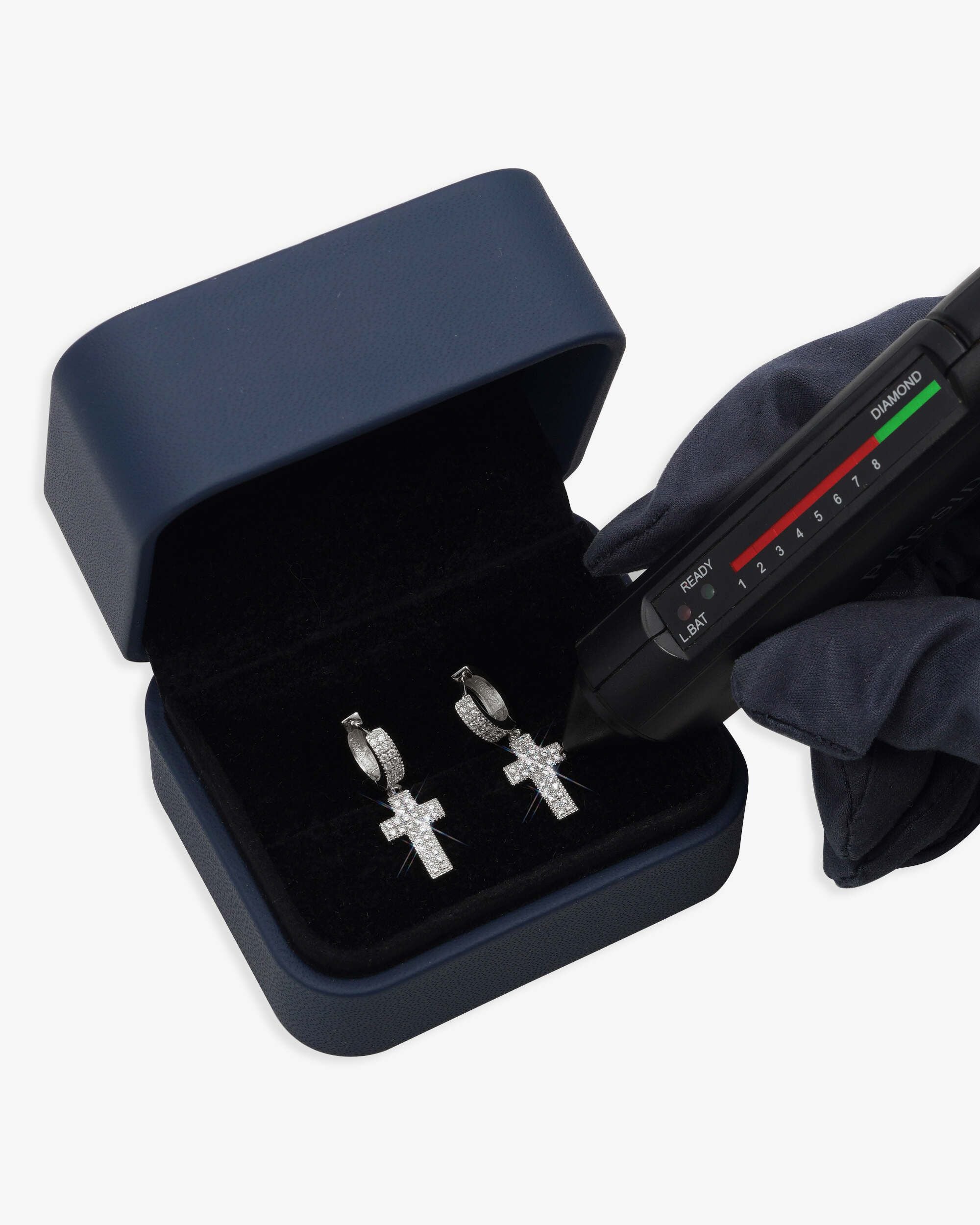 - Package Includes: IceCartel™ Custom Jewelry Box, , 2-Row Moissanite Cross Earrings 14K Gold