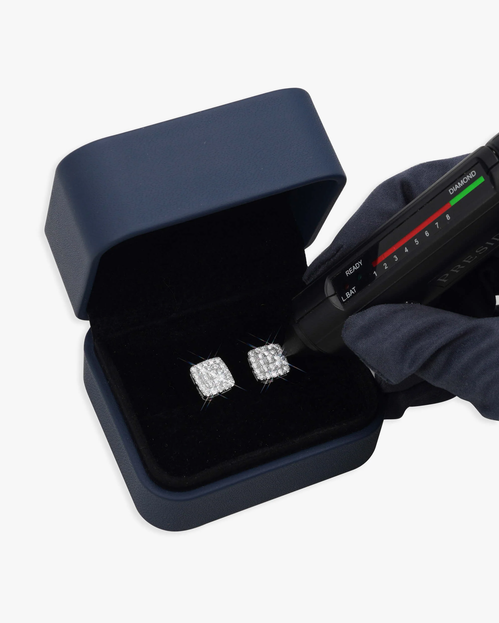 These men's moissanite earrings are iced out with round and emerald cut, colorless (D-Color), VVS moissanite flawless diamonds, placed in a pave and halo diamond setting.