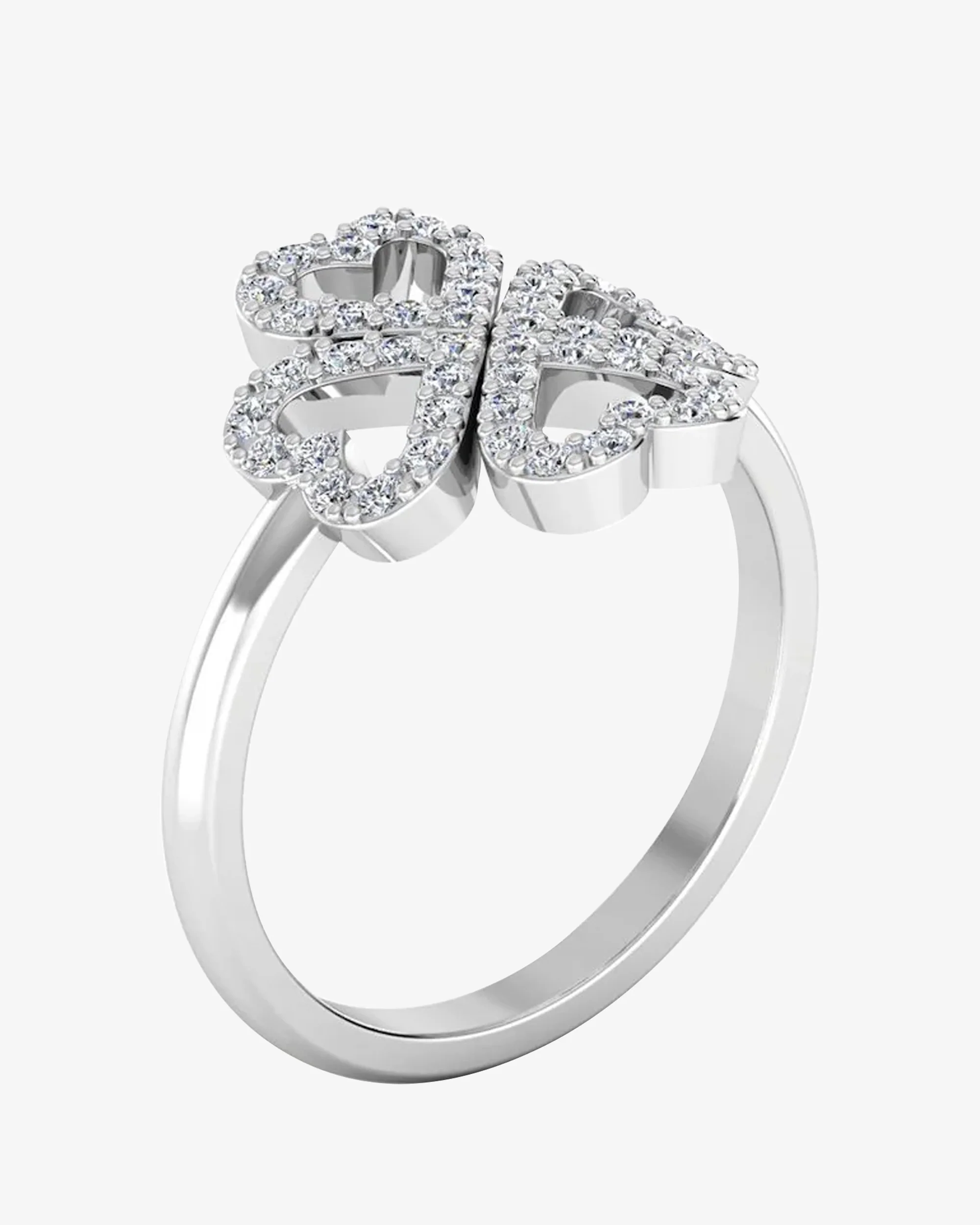 This Four Leaf Clover Moissanite Ring has a moissanite diamond weight of 0.40 CTW. There are 48 moissanite stones on this ring measuring 1.30x1.30 each. The diamonds are set in a prong diamond setting. The four-leaf clover combined with a subtle row of diamonds is a symbol of trust, love and luck.