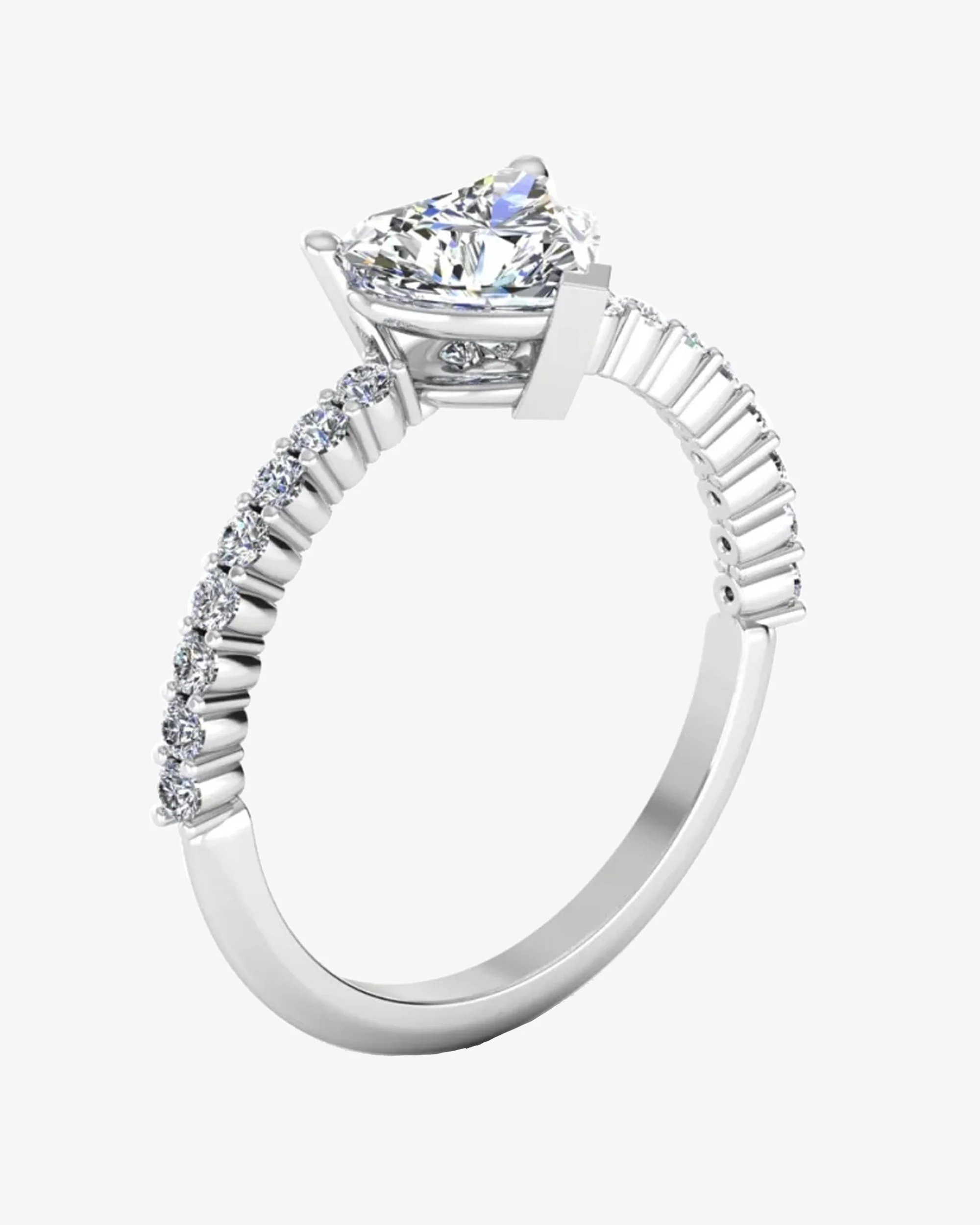 This Heart Bezel Moissanite Engagement Ring has a gold weight of 1.9 grams for 14K gold, 2.28 grams for 18K gold, and a moissanite diamond weight of 1.17 CTW. There are 17 moissanite stones on this ring: the center stone measuring 6.27x6.88MM (Heart Cut) and the stones on the sides measure exactly 1.5x1.5MM (round cut). The diamonds are set in a prong diamond setting to enhance their visual impact. Heart-shaped diamonds signify eternal love.