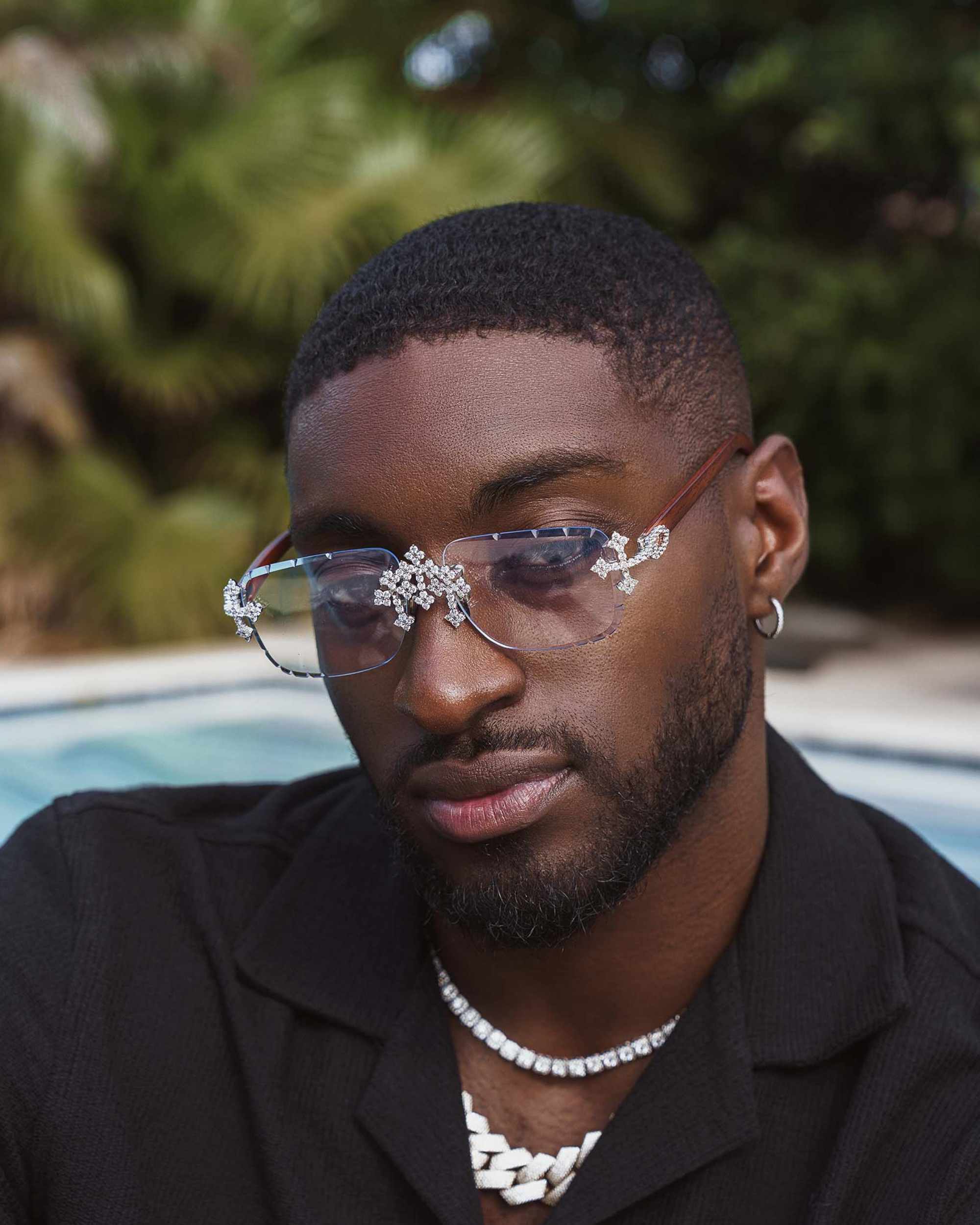 These moissanite sunglasses are iced out with brilliant cut, colorless moissanite diamonds. All of the diamonds on these moissanite diamond sunglasses pass the diamond tester.