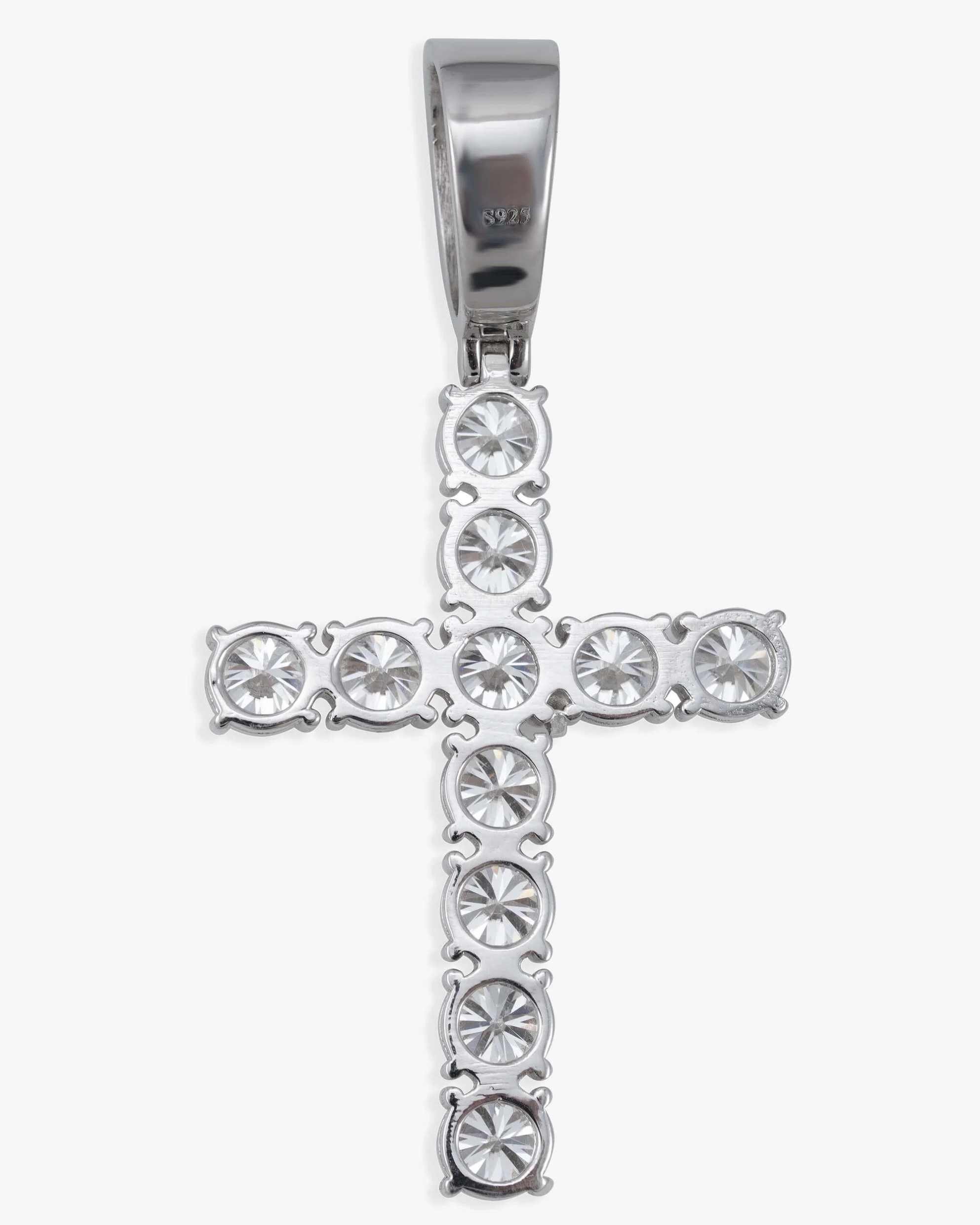 This moissanite pendant is iced out with round cut, colorless (D-Color), VVS moissanite flawless diamonds, placed in a prong diamond setting. All of the diamonds on this moissanite pendant are guaranteed to pass the diamond tester.